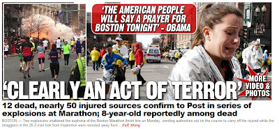 The always-sketchy New York Post either had the BEST coverage of today's horrific bombings in Boston, or the WORST. So far, it was CORRECT about the police having a possible suspect, who is "currently being guarded in a Boston hospital with shrapnel wounds." (The Boston PD blatantly denied it, saying they "didn't know where the Post is getting its information" before NBC and CBS reported the same thing -- HOURS later.) All day, the Post has been saying a dozen people died, while every other news organization has stood by the two figure. So far, no word who is right -- but here's hoping the Post is wrong on this one.