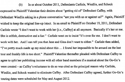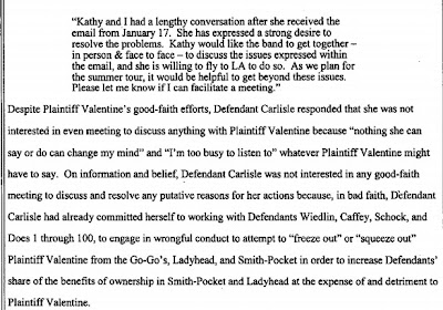 Again, Valentine was apologetic and tried to work things out -- like an adult might -- asking for a face-to-face meeting with the entire band, but was told that Belinda was "too busy to listen" to whatever Kathy had to say and that "nothing she can say or do an change my mind." Can change "her" mind? And you thought the Go-Go's were a band!!!!