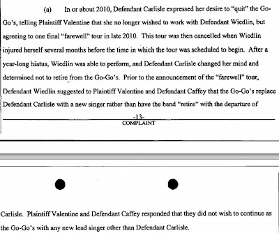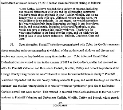 So according to my scorecard, Belinda has tried to fire Charlotte, Kathy and herself -- to get out of working with Jane. The only person she doesn't seem to have a bone to pick with is Gina, who rather ironically was the first Go-Go to drive a major legal wedge through the band when she sued Charlotte of royalties 20 years ago Will be interesting to see how this plays out. The Go-Go's were the rare '80s bands that had all of its original members and now that they don't, it's time for them to call it a day. That the woman they have lined up to play bass this summer is a close friend of Valentine's, whom she hired to fill in for her when she broke her wrist last year, only makes the entire situation more unseemly.